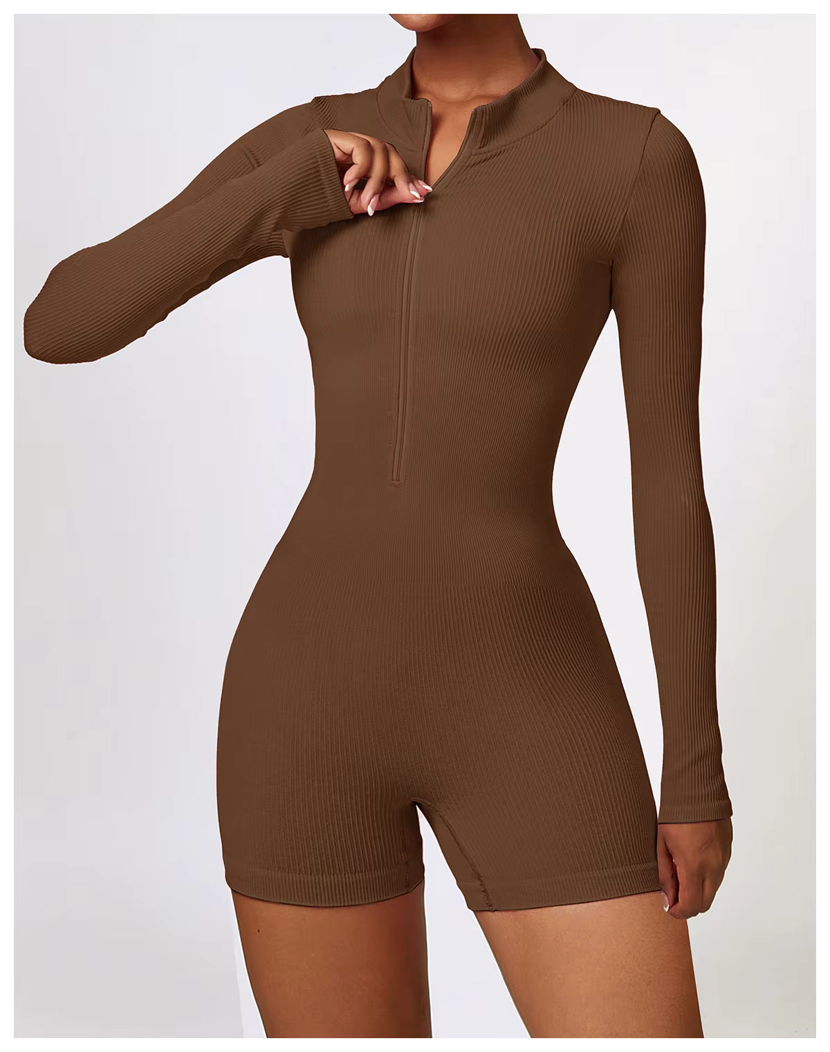 Enterizo o Mono corto manga larga de una pieza en algodon licrado acanalado para mujer, traje informal de verano con cuello alto y cremallera frotal, moldeador de cintura, monos ajustados para ejercicio de adelgazamiento y Yoga.