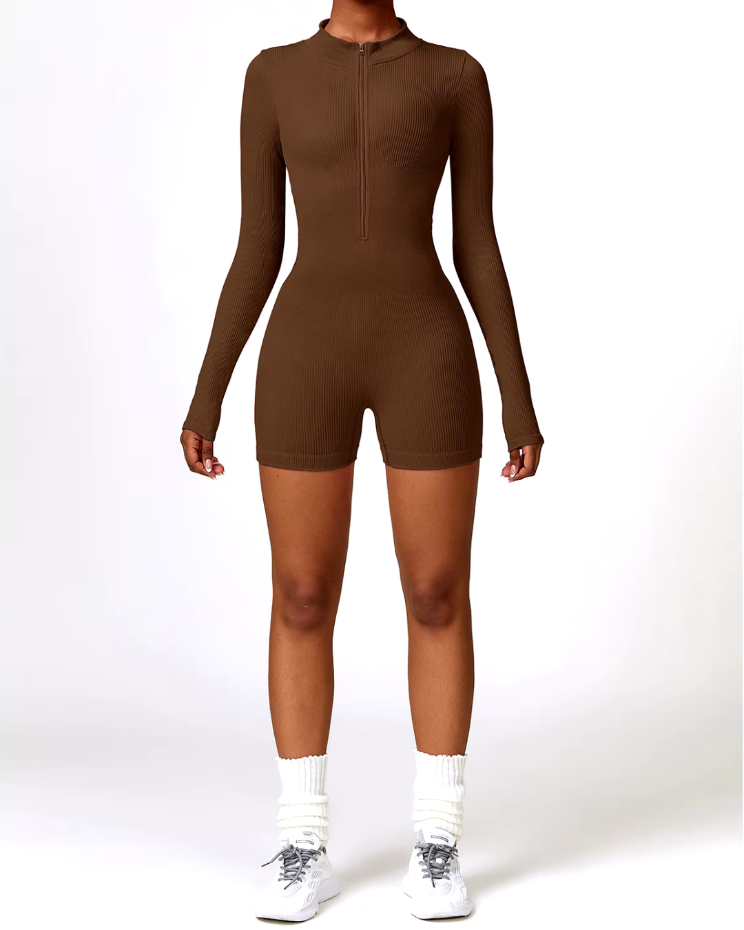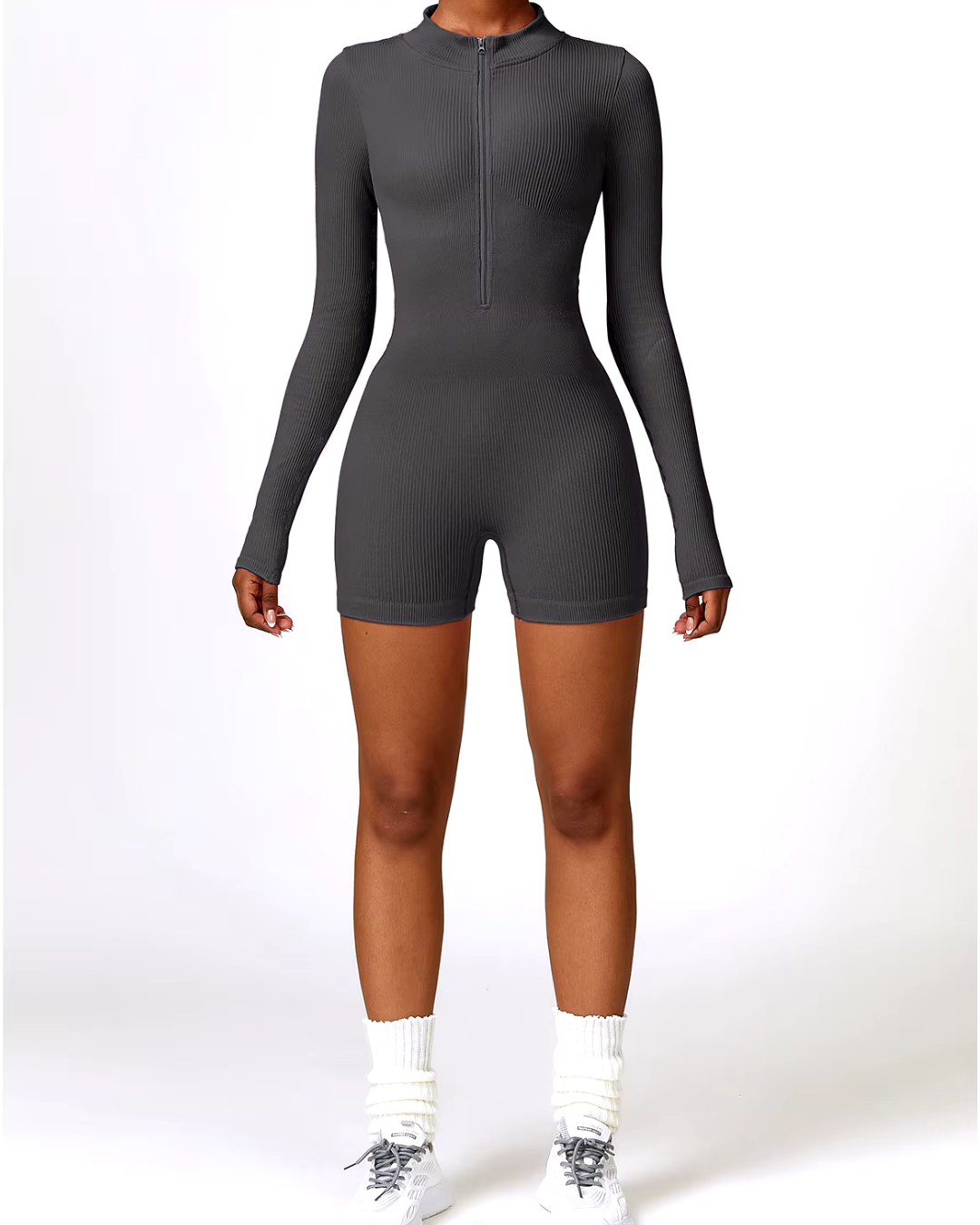 Enterizo o Mono corto manga larga de una pieza en algodon licrado acanalado para mujer, traje informal de verano con cuello alto y cremallera frotal, moldeador de cintura, monos ajustados para ejercicio de adelgazamiento y Yoga.