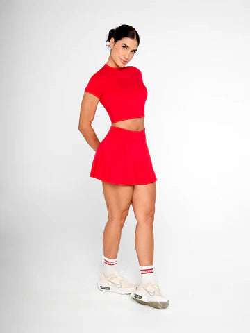Falda de talle alto con tablones delanteros para un look moderno. Incluye short interno con bolsillo lateral, suave al tacto, máxima elongación y aplique PVC.